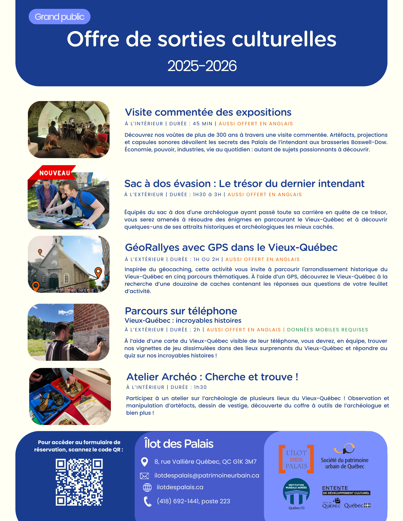—Veuillez choisir une option—GéoRallyes avec GPS dans le Vieux-QuébecVisite guidée des expositionsSac à dos évasion : Le trésor de l'intendantParcours sur téléphone : incroyables histoiresParcours sur téléphone : La vie nocturne à QuébecLocation des voûtes