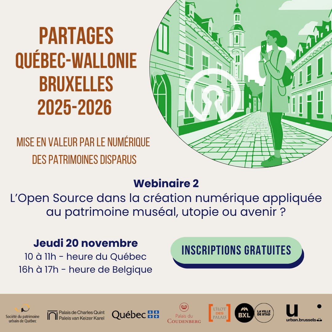 Liste des intervenants : Le Grand Curtius, l’Archéoforum de Liège, la Société du patrimoine urbain de Québec, MySmartJourney, le Musée royal de Mariemont, l’Abbaye de Villers-la-Ville, Urban.brussels, le Musée Horta, les musées de la Ville de Bruxelles, la Porte de Hal et le Nid.
