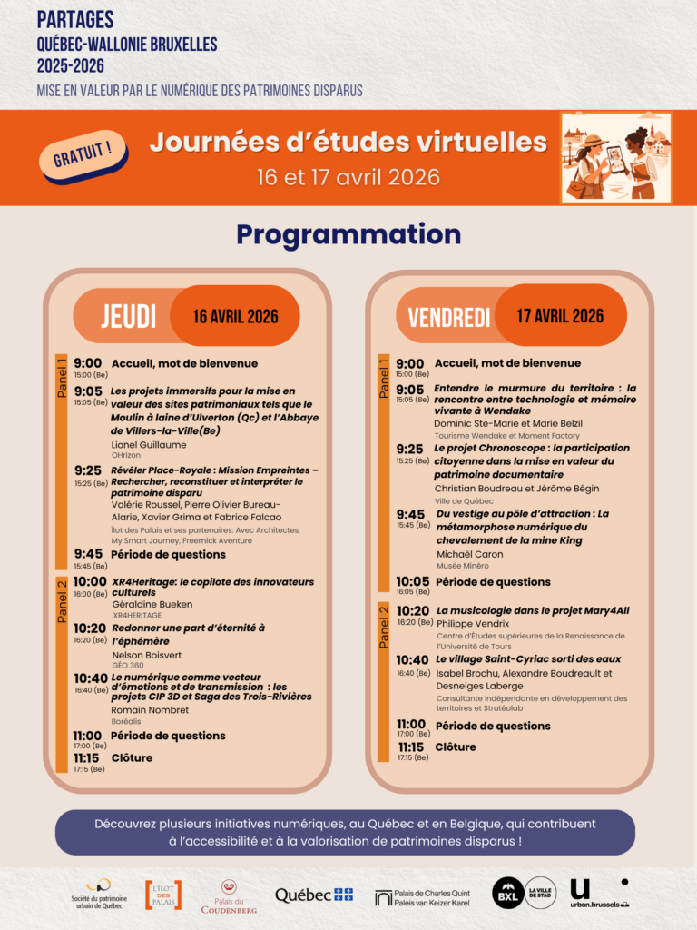 Liste des intervenants : Le Grand Curtius, l’Archéoforum de Liège, la Société du patrimoine urbain de Québec, MySmartJourney, le Musée royal de Mariemont, l’Abbaye de Villers-la-Ville, Urban.brussels, le Musée Horta, les musées de la Ville de Bruxelles, la Porte de Hal et le Nid.